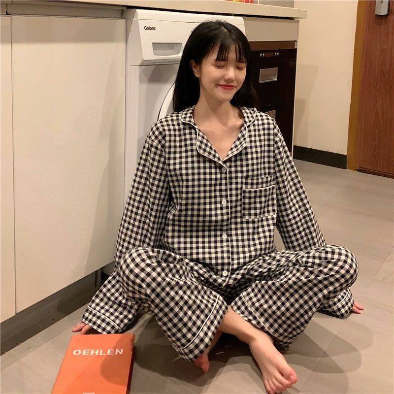 Perempuan Baju Tidur Baju Tidur Wanita Piyama Kotak Kotak Wanita Wanita Musim Semi Dan Musim Luruh Wanita Dengan Kaus Kardigan Nipis Lengan Panjang Wanita Longgar Dua Helai Shopee Malaysia